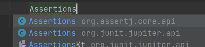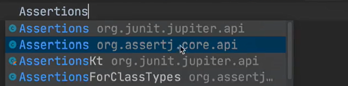 Assertions.을 입력하면 org.junit.jupiter.api와 org.assertj.core.api 두 개가 떠서 임포트를 선택할 수 있어야하는데 아래와 같이 org.assertj.core.api가 뜨지 않았다.