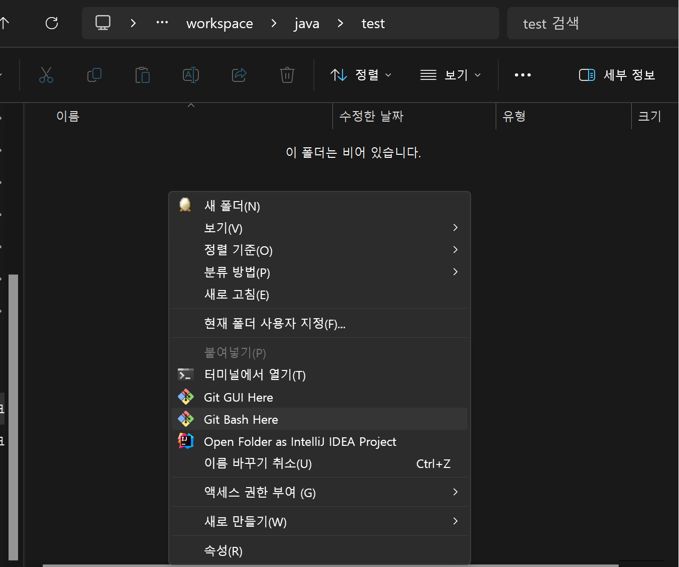 1. ํ๋ก์ ํธ๋ฅผ ์ ์ฅํ๊ณ ์ ํ๋ ํด๋ ์์น๋ก ์ด๋ํด ํด๋ ๋น ๊ณต๊ฐ์ ์ค๋ฅธ์ชฝ ๋ง์ฐ์ค๋ฅผ ํด๋ฆญํ๋ค.