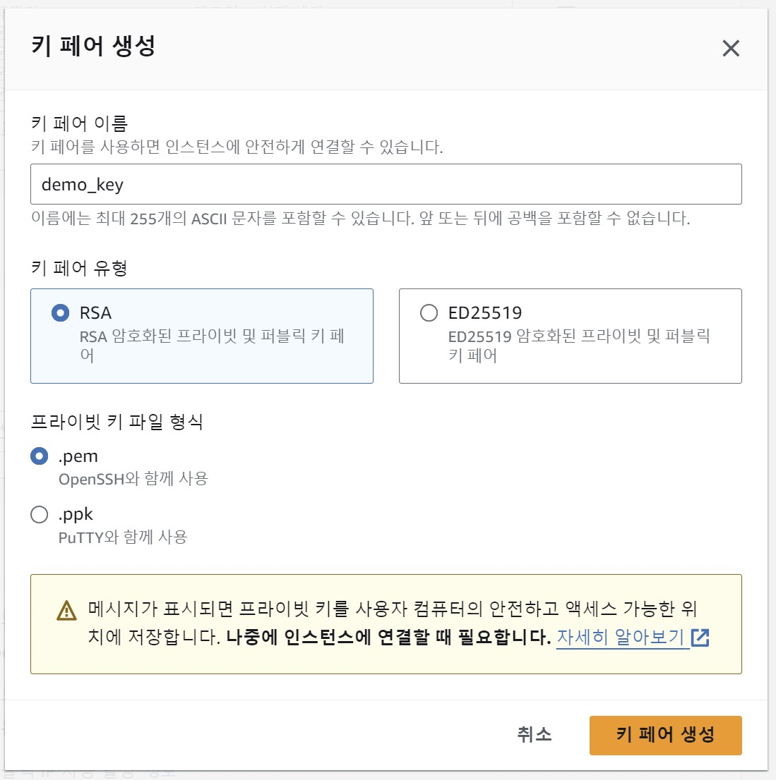 키페어 이름을 입력하고 키 페어 생성을 누른다. 자동으로 키페어가 PC에 다운로드 된다.