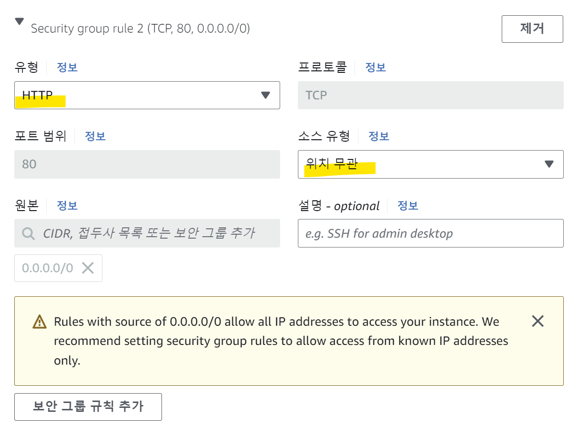 위치 무관은 외부의 모든 IP에서 접근할 수 있도록 하는 것이다. 웹 서버 통신을 위해 웹 서버 규칙을 설정해보자. 아래 보안 그룹 규칙 추가를 클릭한다.