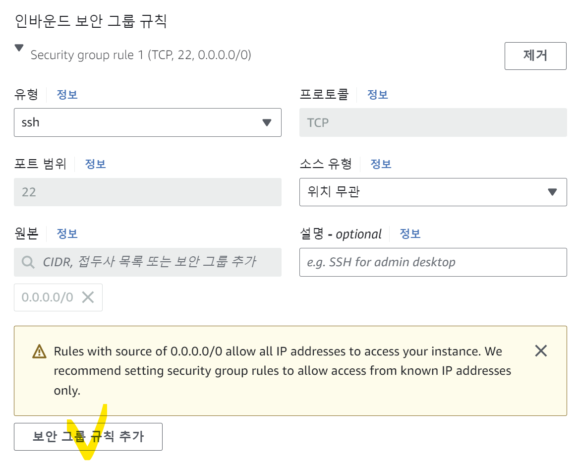 보안 그룹 규칙을 추가해보자 인바운드란, 외부---> 인스턴스 이렇게 외부에서 인스턴스로 들어오는 트래픽, 요청에 대한 보안 설정이다. SSH통신을 위해 기본적으로 22포트는 오픈이 되어있다. SSH통신을 원한다면 기본값으로 그냥 두면 되고 HTTP통신을 하고 싶다면 80포트에 대한 규칙을 추가한다.