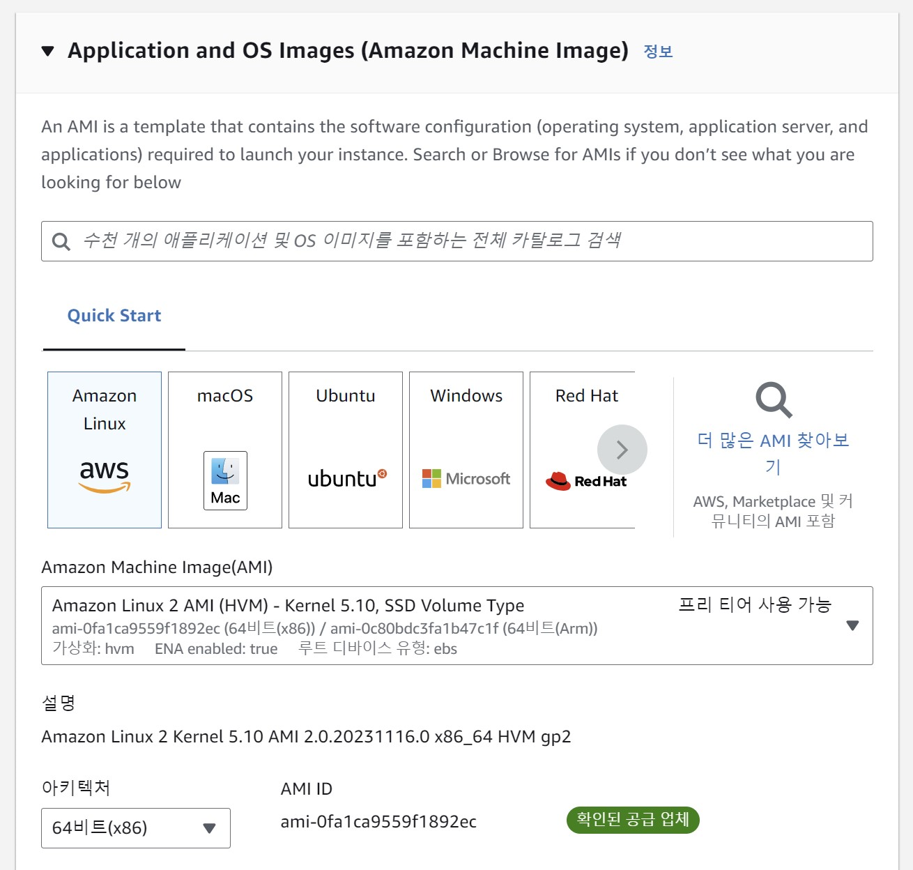 원하는 AMI가 없다면 오른쪽 '더 많은 AMI찾아보기'를 클릭하여 화면에 보이는 것 이외에도 많은 AMI를 확인하여 선택할 수 있다.