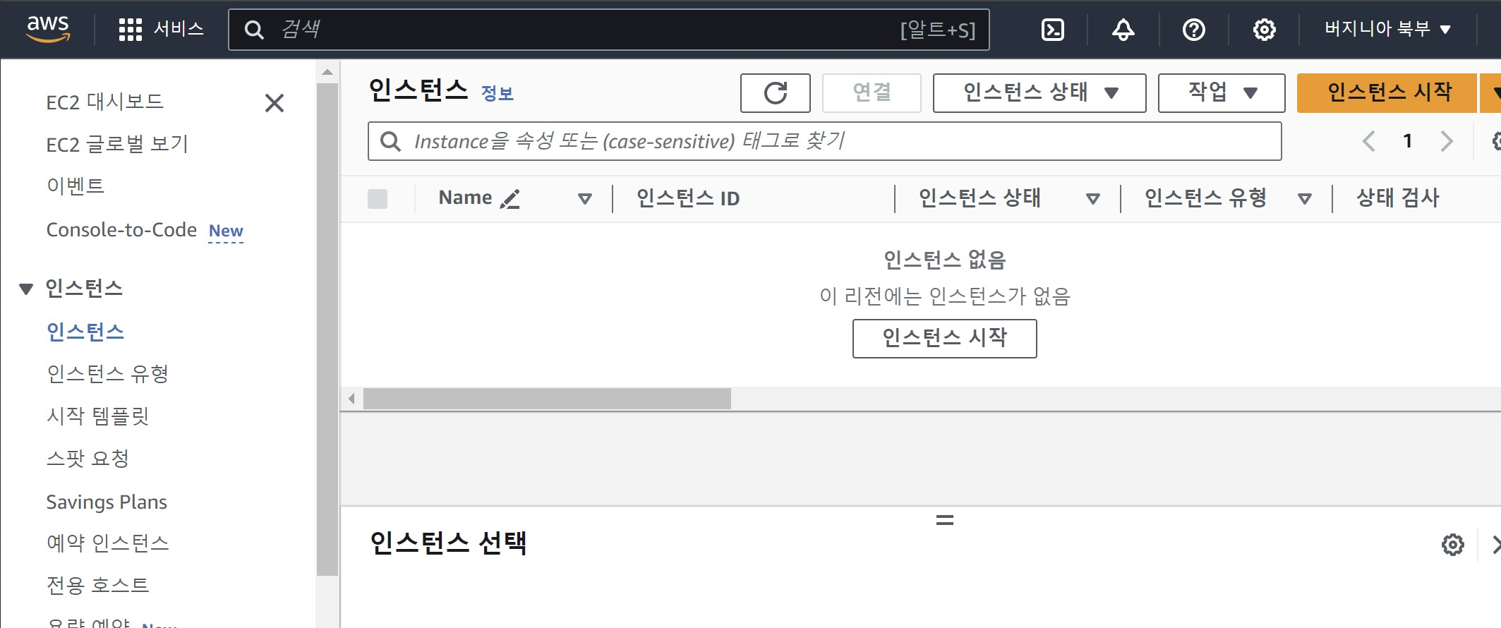 그러면 이러한 화면이 보일 것이다. 현재 생성해둔 인스턴스가 한 개도 없는 모습니다. 인스턴스 생성을 위해 오른쪽 위에 [인스턴스 시작] 버튼을 누른다.