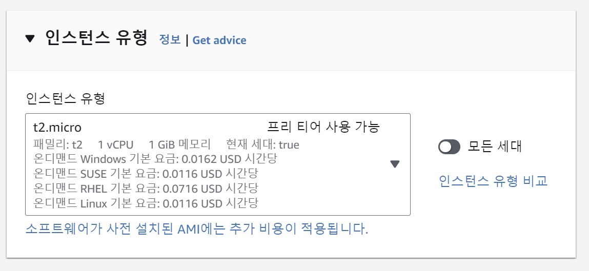 인스턴스 유형을 선택한다. 프리티어 사용이 가능한 t2.micro를 선택한다.