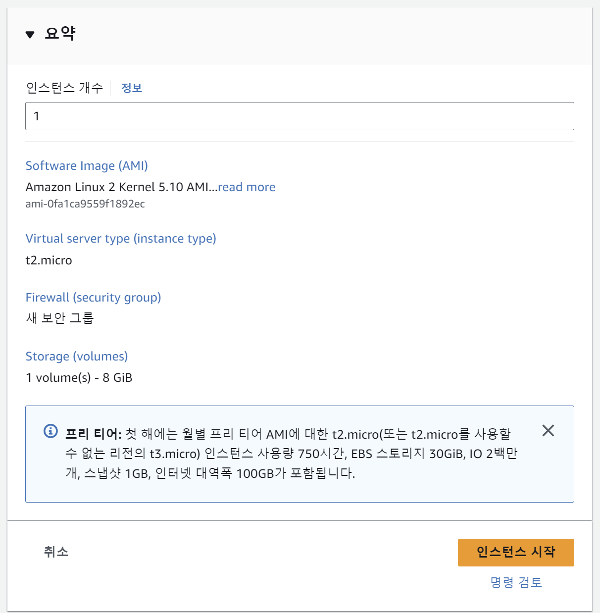 마지막 요약에서 내가 선택한 설정들의 주요 정보를 확인할 수 있다. 확인 후 인스턴스 시작을 클릭한다.