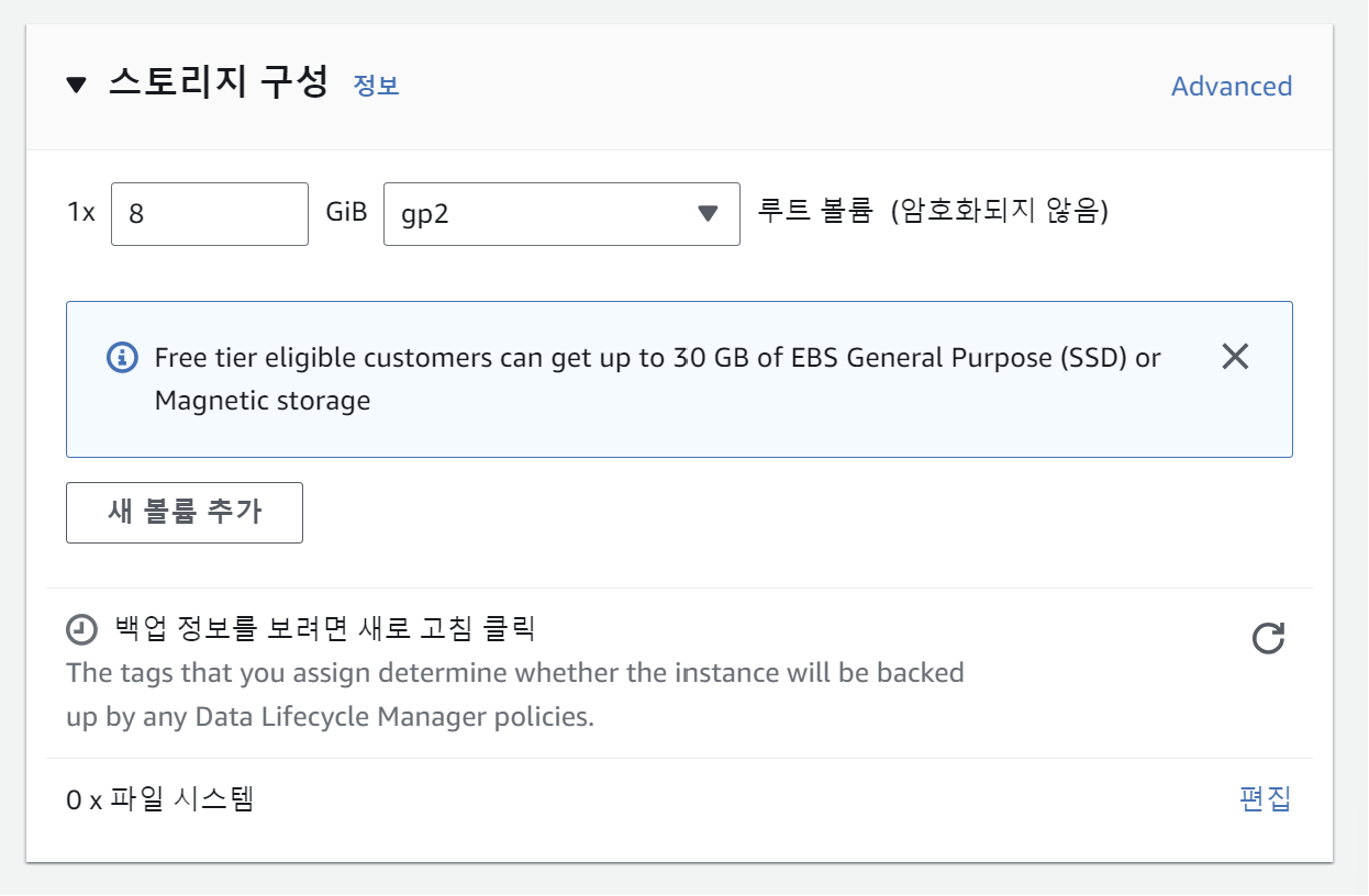 최소 8GB부터 설정이 가능하다. 프리티어의 경우 30GB까지 무료로 사용이 가능하다. 기본값으로 설정하였다.
