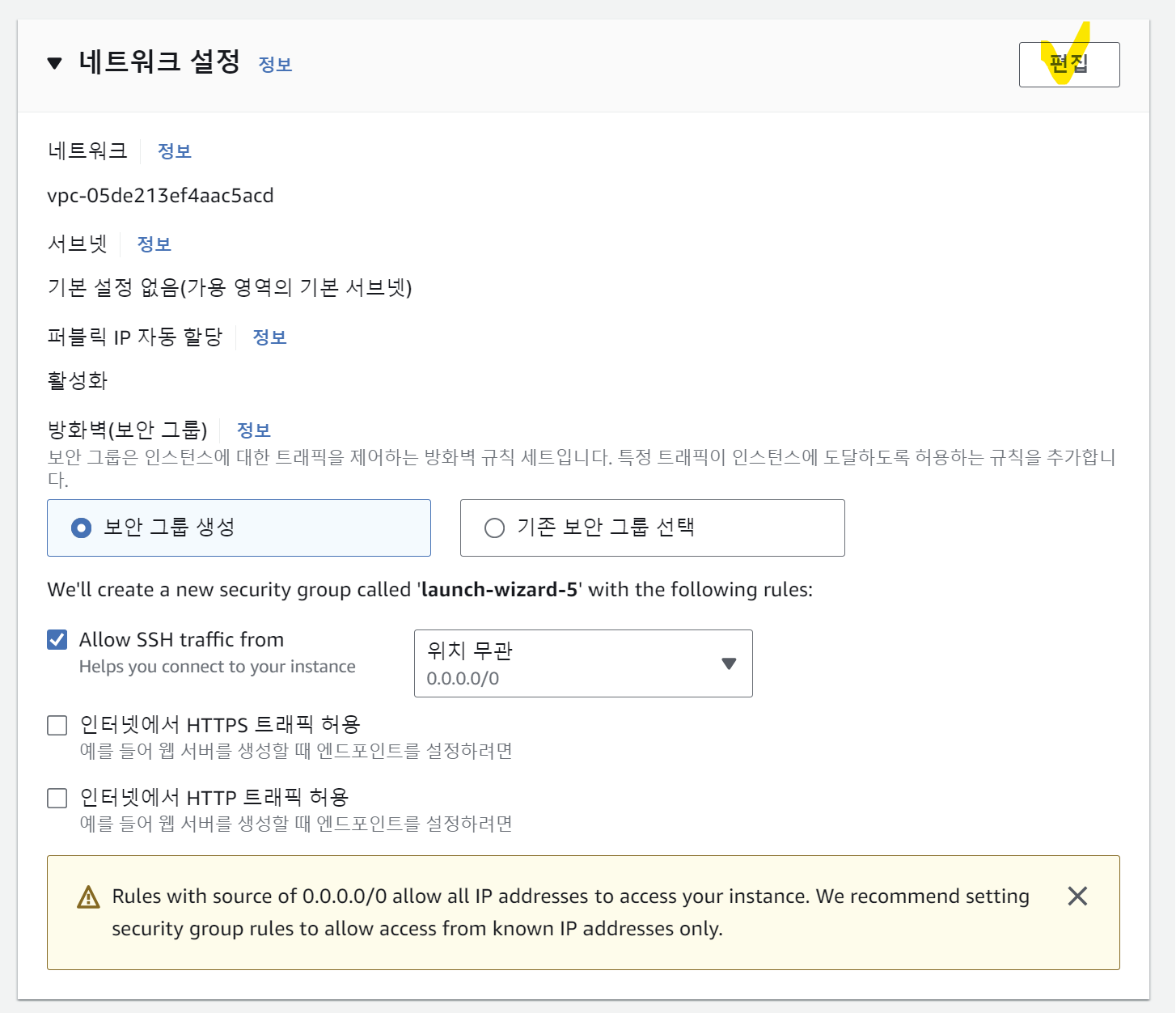 보안 그룹 설정을 위해 네트워크 설정에서 오른쪽 위 편집을 누른다.